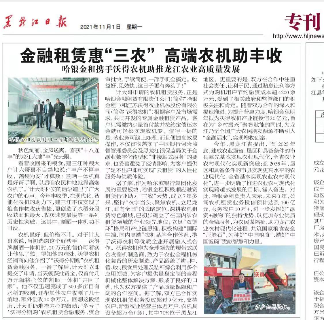 ????????2021年11月1日,黑龍江日報(bào)專門刊登了我司金融租賃助力龍江農(nóng)業(yè)高質(zhì)量發(fā)展的報(bào)道。